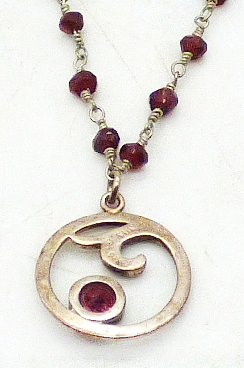 Description: Signed sterling sliver round pendant set with a genuine garnet stone hangs from a delicate garnet bead and sterling link chain finished with a length of silver chain and lobster clip. Signed '925' and possibly '©SAIK' though mark is not clear, on the back of the pendant.