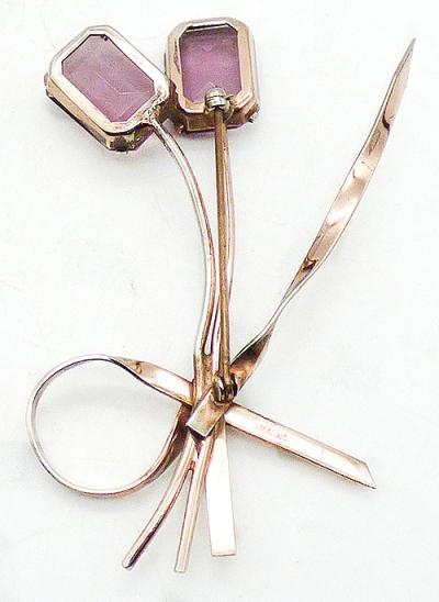 Description: Coro sterling silver vermeil delicate Retro floral brooch; two good-sized amethyst glass rectangle flowers on long stems with a long, narrow leaf off to one side. The small bouquet is tied with a narrow ribbon at the bottom. Signed 'Coro Stering' on block letters on the back.
