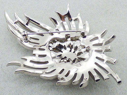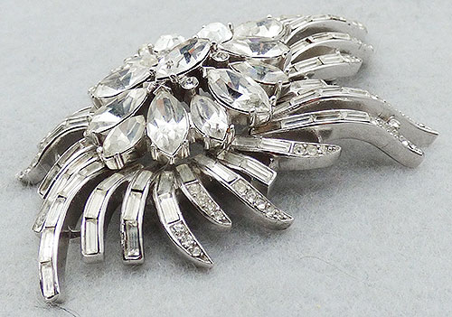 Description: Trifari vintage rhodium plated clear rhinestone navette and baguette tendrils brooch; a cluster of clear navette rhinestones in the domed center of tendrils radiating out from all sides. The tendrils, both short and long, are set with clear rhinestone baguettes near the center and small chatons towards the ends. Signed crown 'Trifari©' on the back.