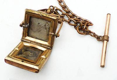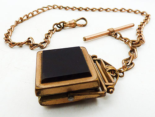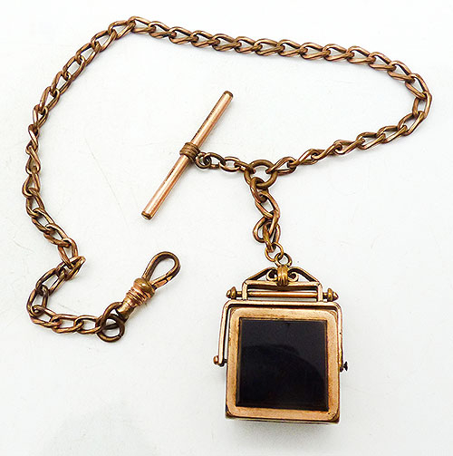 Description: Victorian gold filled watch chain and reversible locket fob; a thick square fob that hides a a locket that holds two photos. A reversible fob that flips between a square onyx stone on one side and a square carnelian stone on the other.