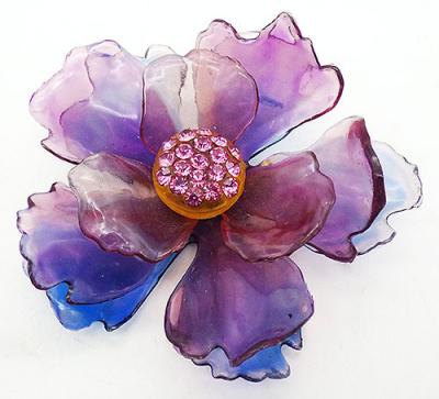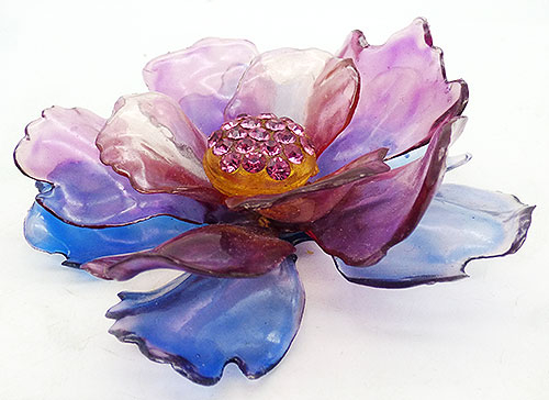 Description: Cellulose Acetate vintage oversized flower brooch; three layers of cellulose acetate petals - blue on the bottom, purple in the middle and pink on the top. The center is yellow-ish lucite studded with pink rhinestones.