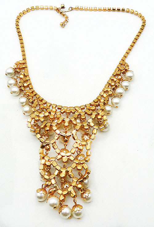 Description: Vintage gold plated cess rhinestone and fur pearl dangle bib necklace; white faux pearls hang from the ends of clear rhinestone scallops that create the leg narrow column center focus. More pearls dangle along a second row of rhinestones on either side of the column and then the necklace is finished with clear rhinestone chain. Hook closure on one side.