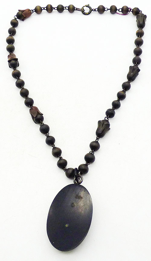 Description: Victorian black vulcanite mourning cameo on a brown vulcanite bead chain necklace; the left facing woman is mounted on a plain oval base. The chain is individually linked round and molded petal beads with a spring ring clasp. The cameo has the burnt rubber smell associated with vulcanite.
