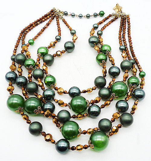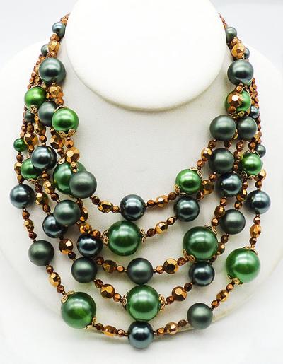 Description: Vendome vintage green faux pearl and copper crystal bead 5-strand necklace; graduated size green faux pearls, slightly smaller very dark green pearls and matte green pearls are separated with groups of larger and smaller copper crystal beads. The five strands are finished with the small copper crystals which attach to gold tone leaf connectors. Green pearl extender chain on one side, flower hook on the other. Signed 'Vendome' on the hook.