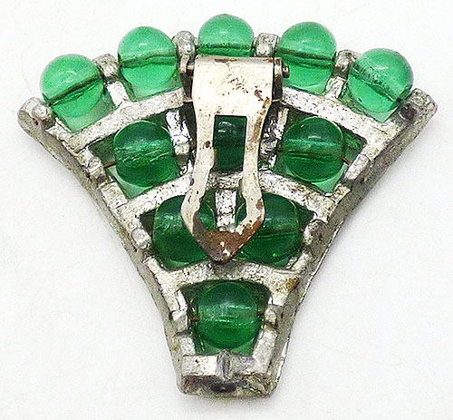Description: Vintage fan shaped pot metal green glass bead dress clip; the green uranium glass beads glow yellow under a black light, see last picture. The horizontal rows are set with clear rhinestones and they are separated with vertical bars with metal bead decoration in between the round green glass beads.
