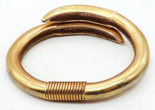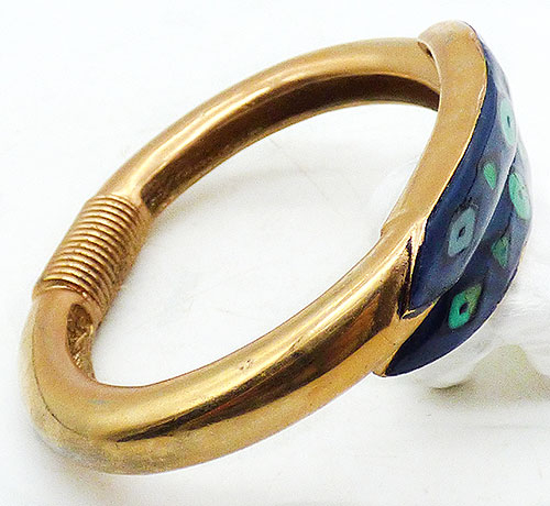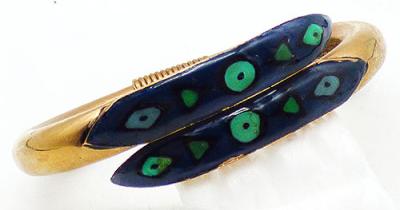 Description: Eisenberg vintage gold plated and enamel bypass bracelet; the golden tubular band flattens out as the pointed ends bypass each other across the top. The navy blue enamel is decorated with green, turquoise and slate blue shapes. The band is spring loaded on the bottom for easy on/off. Signed 'Eisenberg©' on the back of both ends.