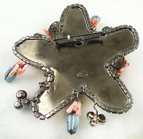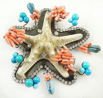 Description: Lawrence Vrba massive starfish brooch a huge realistic 3-dimensional ivory colored resin starfish on a black metal backing edged in clear rhinestones with large rhinestones on wires acting as prongs. Large clusters of faux coral, vibrant shades of turquoise round cabochon trios and simulated turquoise with pieces of cora alll float on wires around and above the starfish. Signed 'Lawrence Vrba' and 'Made in USA' on the back.