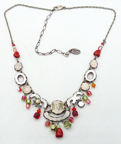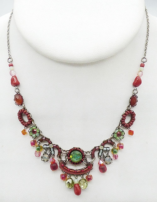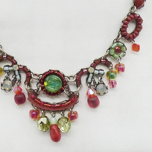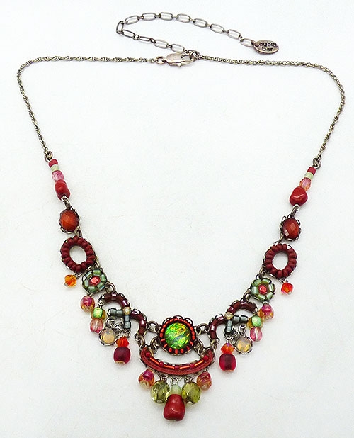 Description: Ayala Bar Classic Collection from 2019 or earlier; handmade with a green foil glass bead in the center surrounded by small brick red metallic beads, carnelian green pale green glass crystal dangles, and a variety of carnelian and green glass bead florets, ovals and dangles. Signed with the 'AB' logo on the back of the centerpiece and 'Ayala Bar and her 'AB' logo on the hang tag.