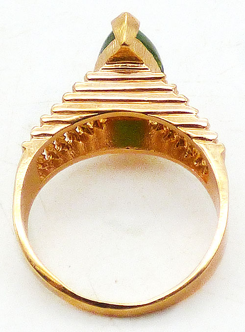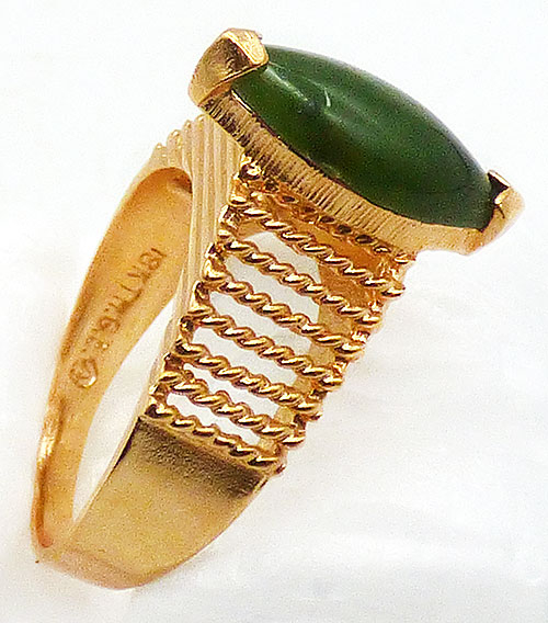 Description:  Aurora Jewelry Co 18kt HGE (heavy gold electroplate) jade ring; a marquis cut green jade stone is mounted on top of stacked and grooved setting with rows of twisted gold wire along the tapered sides. Signed 'A' in a circle (mark for Aurora Jewelry) and 18KT HGE on the inside of the band.